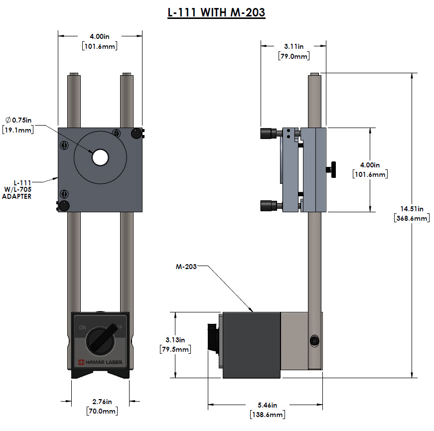 The L-102 Beam Translator is an optical beam-steering device used to translate the vertical and horizontal position of Hamar’s straight-line lasers without affecting the angle of the laser beam. It is typically used with the L-111 Laser Stand and features coarse and fine adjustments for translations as small as .0001 in. (0.0025 mm) and ± .100 in. (±4 mm) maximum beam displacement.
