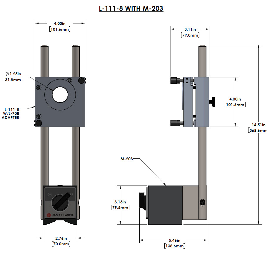 The L-102 Beam Translator is an optical beam-steering device used to translate the vertical and horizontal position of Hamar’s straight-line lasers without affecting the angle of the laser beam. It is typically used with the L-111-8 Laser Stand and features coarse and fine adjustments for translations as small as .0001 in. (0.0025 mm) and ± .100 in. (± 4 mm) maximum beam displacement.