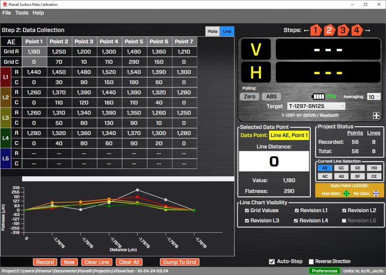 Step 2 – Data Collection – Line View is used to record the flatness data for an individual line during the lapping (resurfacing) process when the plate fails calibration. After resurfacing the plate to use Line View, you first select the file with the previously recorded plate data, then go to Step 3, and look at the data tables to find the line with the highest flatness error. Go back to Step 2 and click on the Line View tab, select the line segment from the Current Line Selection display area and Plane6 automatically loads the data for that line segment from the saved file. Then setup the laser, straightedge and target, position the target at the first point and hit Record. Continue to record the data for that line until finished. Plane6 will then zero the end points, calculate the flatness error for each point and plot the data in the graphing area. It also shows a graph of the previously recorded plate data for comparison. If the flatness error is not acceptable, you can repeat the process and record a second set of data. It will also be plotted along with the 2 previous sets of data but with a different line color. You can take up to 5 sets of data.