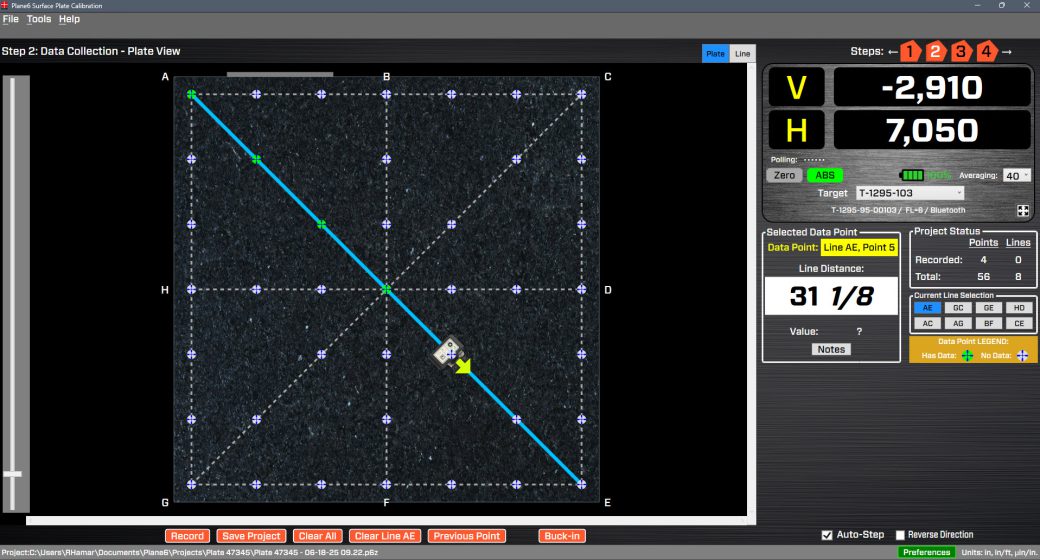 Step 2 – Data Collection – Plate View is used to record the flatness data. Plane6 guides you through the fastest way to take the data. It starts off with line segment AE. Once the laser is set up, you click Record to take the first data point. Then Plane6 automatically moves the target icon to the next point and displays the Line Distance (see Selected Data Point display area) on the straightedge scale to place the target for the next point. The recorded-point icon changes color to green to indicate data has been taken. Continue until all the lines are measured. You can reverse the direction of the data taking for a given line and retake any point. A target icon tells you what point you are on and what direction its going. You can also hover over or click on a point to see the value recorded. The data updates in real-time and it has an adjustable sampling rate. When done recording a line, Plane6 automatically selects the next line in the sequence (see the Current Line Selection display area).